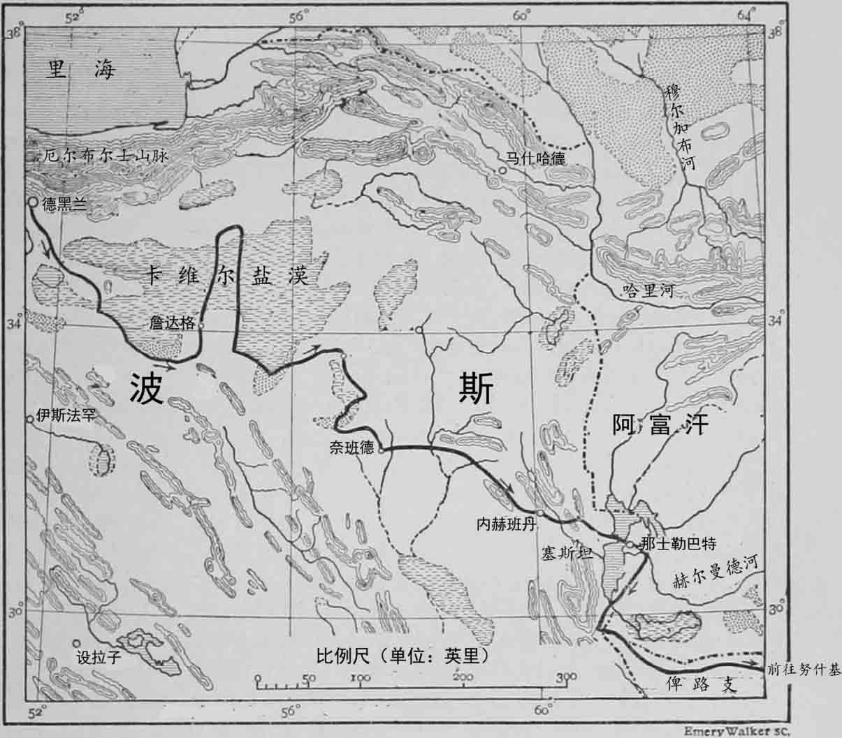 我们离开村落后就再也看不到一点生命的迹象,在我们的东南方,一些孤零零的小山丘像海中的小岛般立着。远处是一望无际的沙漠,像海平面一般延展开来。旅行队穿过沙漠广袤的无人地带,从一个绿洲走到另一个绿洲,在北方是一个被称为卡维尔盐漠的大片区域,在那里看不见哪怕最小的绿洲,没有草堆,甚至连一片草叶也没有,因为这块沙漠浸润在盐里,冬天下雨时,咸的黏土会变得像冰地一样滑,这正是我们要去的地方。