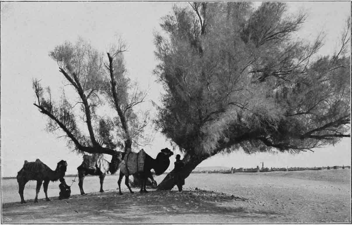 沙漠的边缘有风堆积起来的沙丘,柽柳和梭梭经常长在这里,这两种都是草原灌木,高约几英尺,它们的枝干非常硬,是我们理想的燃料,我的仆人收集了一大捆树枝将营火烧得又亮又旺,黄色的火苗飘舞在寂静的沙漠中。