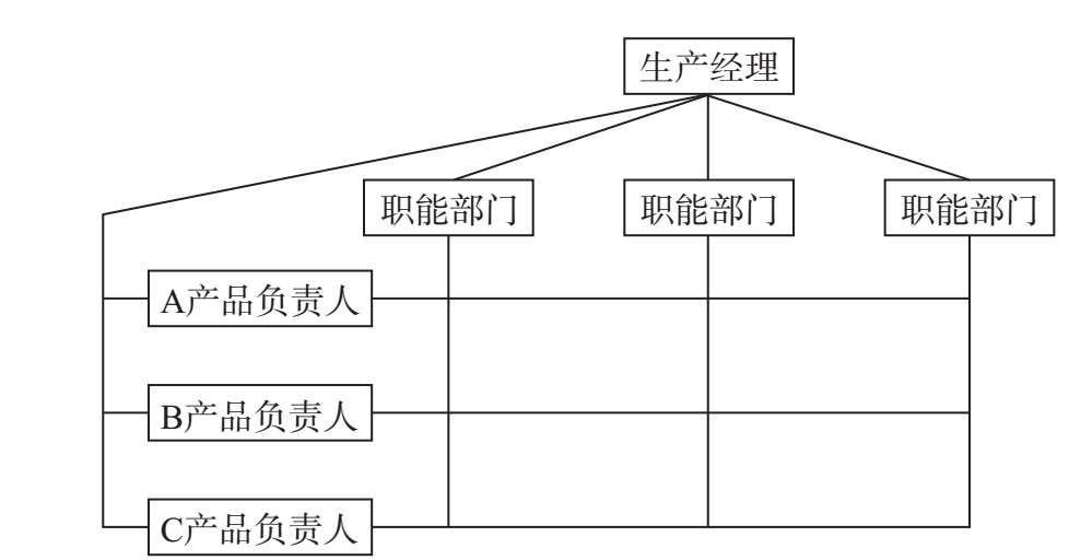 在组织结构上,把既有按职能划分的垂直领导系统,又有按产品(项目)划分的横向领导关系的结构,称为矩阵式组织结构,如图1-6所示。