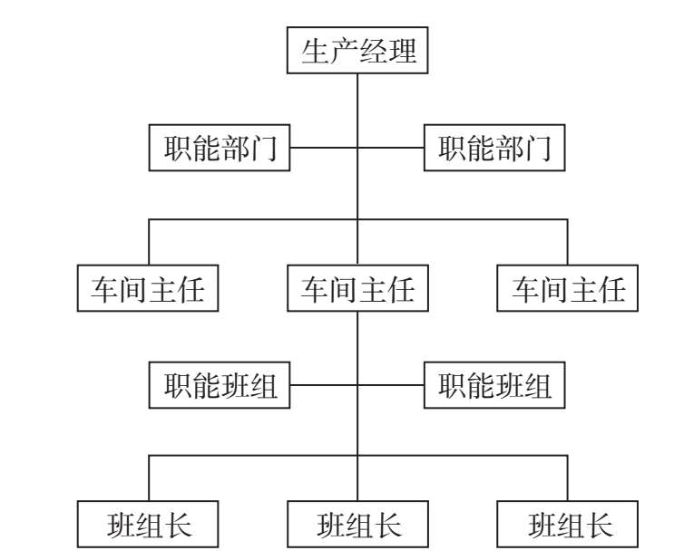 职能制组织架构,是各级行政单位除主管负责人外,还相应地设立一些职能机构,如图1-2所示。如在生产经理下面设立职能机构和人员,协助生产经理从事职能管理工作。这种结构要求行政主管把相应的管理职责和权力交给相关的职能机构,各职能机构就有权在自己业务范围内向下级行政单位发号施令。因此,下级行政负责人除了接受上级行政主管人指挥外,还必须接受上级各职能机构的领导。