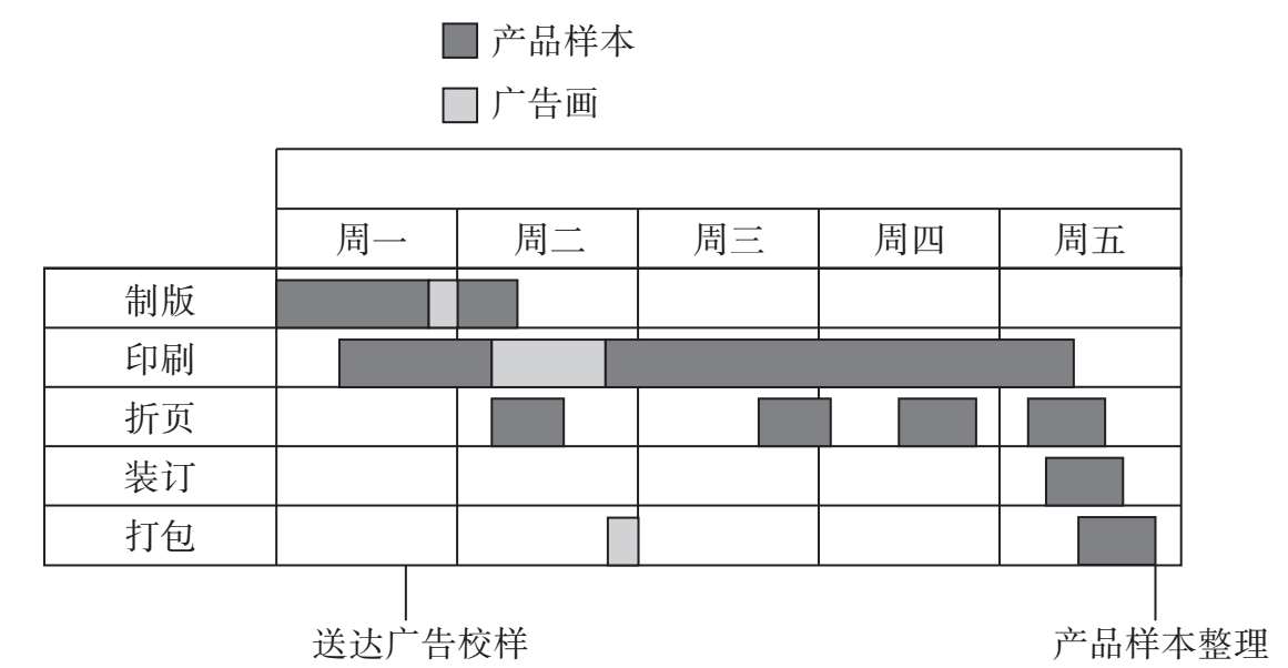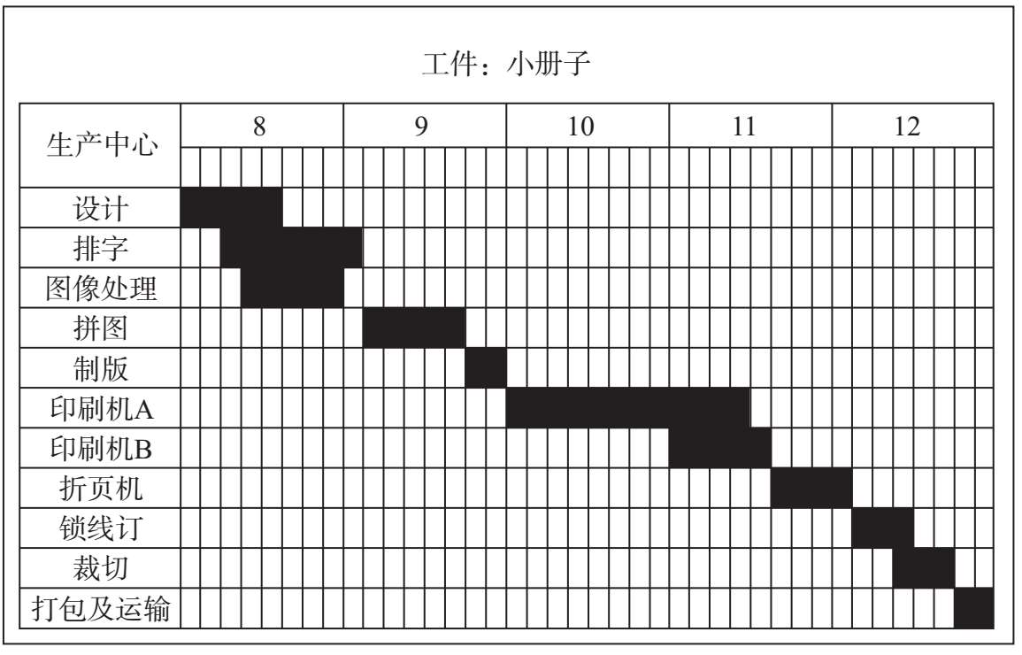 印刷厂的作业调度计划系统必须适应全部设备或工作中心、印刷活件以及交货期的范围。该系统允许迅速和频繁地更新,使得管理人员和生产人员更容易了解和掌握。前面介绍了制定单机或双机作业调度计划的优化决策规则,许多重复生产型印刷企业存在上述情况,但它们并不适用于普通的商业印刷厂。印刷业通常利用甘特图制定印前大型作业调度计划和印刷及印后加工作业调度计划。
