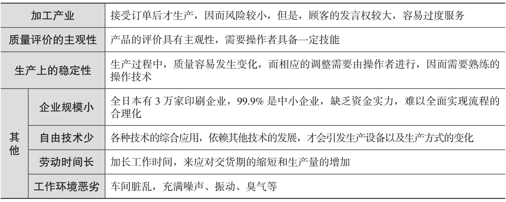 再从订单竞争方面来看,为了应对越来越短的交货期,或者为了确保生产量,企业里加班现象非常普遍。政府有关管理部门一直在要求缩短工作时间,印刷界也必须把缩短工作时间作为课题加以重视。表1-1列出了印刷企业的特征。