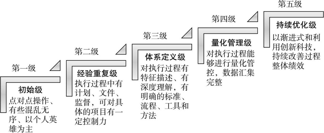 与此同时,行业内有些管理水平相对高一些的企业,出于自身战略发展的需要,对营销体系建设提出了更高的要求,也就是体系的可复制推广能力。对于这样的企业,其营销体系建设则需要在更高的一个维度上进行,如果说“被动体系建设”是印企营销体系1.0版的话,“主动体系建设”就是2.0版,而体系的可复制推广能力建设就是3.0版了。本书的后面章节会重点讨论印企营销体系3.0的建设要点。为了大家更好地理解体系建设不同阶段的特点,我们有必要了解一下体系成熟度模型。图0-2是“能力成熟度模型(Capability Maturity Model),简称“CMM”,是美国软件工程研究所1991年提出的。PMI(美国项目管理协会)在此基础上于2003年发布了“组织项目管理成熟度模型”(Organizational Project Management Maturity Model)简称“OPM3”。虽然“项目成熟度模型”由多家国际组织推出了各自不同的几十个版本,但总体来说CMM还是影响最大,被人们广为接受的模型。