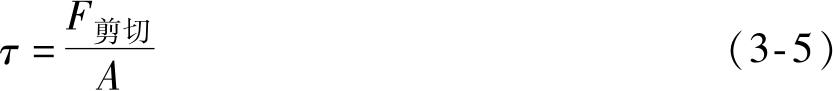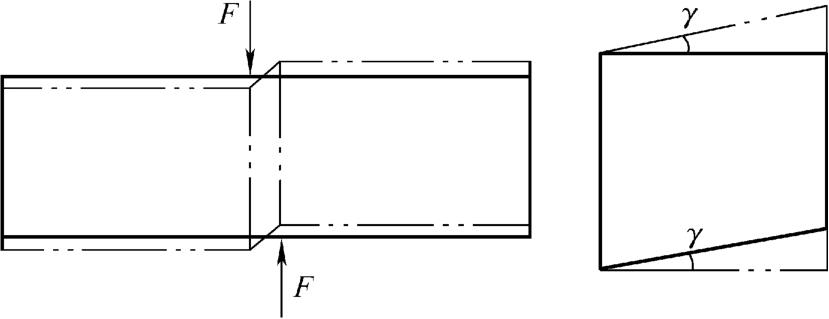 如图3.2所示的受力情况,圆柱试样承受如下所示的载荷,载荷与受力截面平行,此类载荷与前面所述拉伸载荷不同,承受此载荷会使这两个平行面间的任一(平行)横截面产生错动变形,此变形称为剪切变形。