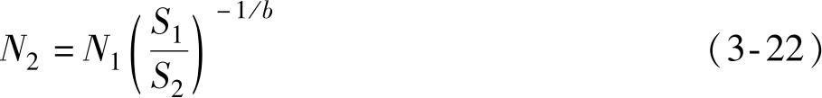 在双对数坐标下, S = bN ,已知点( S 1 , N 1 ),即可确定 S 2 应力水平下的疲劳损伤循环次数 N 2 :
