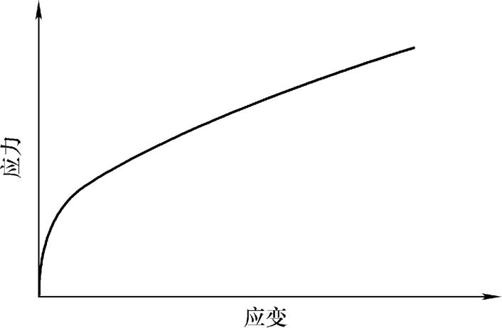 这种函数关系一般与材料特性、结构的变形相关,与应力的状态无关。根据强度理论可知,可选择单向应力状态来建立这种函数关系,单向均匀拉伸或者压缩试验是反映材料力学行为的基本试验,材料开始进入塑性变形的应力称之为屈服应力,在屈服之前,应力与弹性应变呈线性关系,可参考式(3-12)。一般材料在进入塑性状态后,继续变形将会产生强化,卸载后再加载时,材料的屈服应力将增加,这种不断更新的屈服应力称为后继屈服应力,通过试验获得的真实应力-应变曲线一般都是非线性关系。