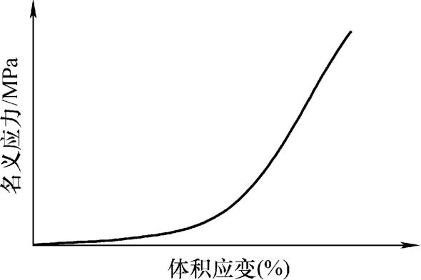常用的材料本构模型有理想弹塑性材料模型、幂指数硬化材料模型、刚塑性线性硬化材料模型、弹塑性线性硬化材料模型等。Crush-able材料模型为泡沫类材料或者近似泡沫类材料常用到的材料本构模型,在LS-Dyna里面的材料模型为MAT63号或者MAT163号,除了需要定义密度、初始弹性模量和泊松比外,还需要输入名义应力-体积应变曲线(图3.5),且曲线输入可以基于不同应变率。此模型可以用来模拟裸电池单体受挤压变形时的本构关系。