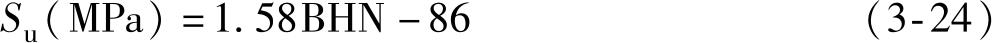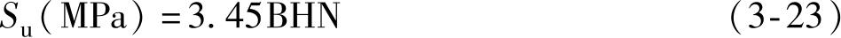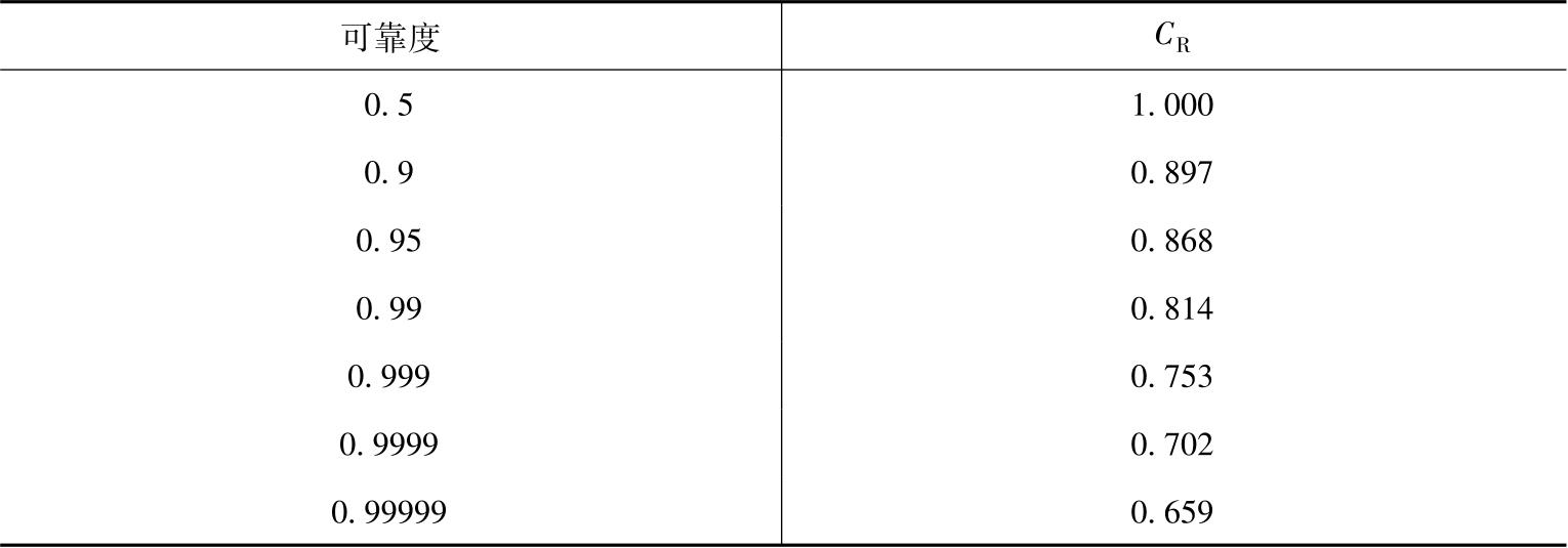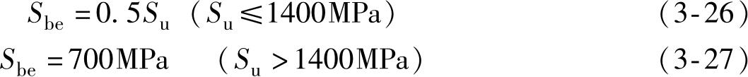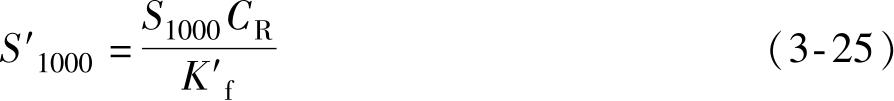 式中, C R 为在规定可靠度下的修正系数; K′ f 为1000 次循环时的疲劳强度折减系数。根据大量研究表明, S 1000 在弯曲加载时近似等于90%的极限抗拉强度 S u ,而在轴向加载时近似等于75%的极限抗拉强度 S u ,在扭转加载时,其近似等于90%的极限剪切强度 S us 。如果考虑疲劳数据统计的分散性,则需要在规定可靠度水平的中值基准 S-N 数据的基础上,对零件的疲劳强度进行修正,在缺乏严格统计分析数据时,可以参见表3.3所示的可靠度系数进行修正。