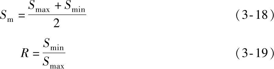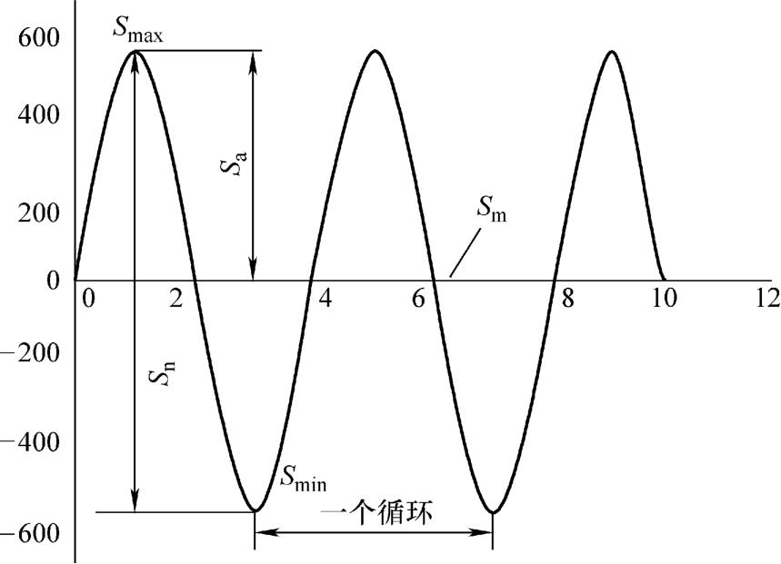 在某点或某些点承受扰动应力,且在足够的循环扰动之后形成裂纹或完全断裂的材料中所发生的局部永久结构变化的发展过程,称为疲劳。提到“疲劳”就会联想到“疲劳寿命”,疲劳寿命的定义是这样的:足够多的扰动载荷作用之后,从高应力或高应变的局部开始形成裂纹,直至到达临界尺寸而发生完全断裂,最后的断裂,标志着疲劳过程的终结,这一发展过程所经历的时间或扰动载荷作用的次数,称为“疲劳寿命”。图3.9所示为关于循环应力与循环次数的介绍。循环的应力幅 S a 、平均应力 S m 以及应力比 R 表示如下: