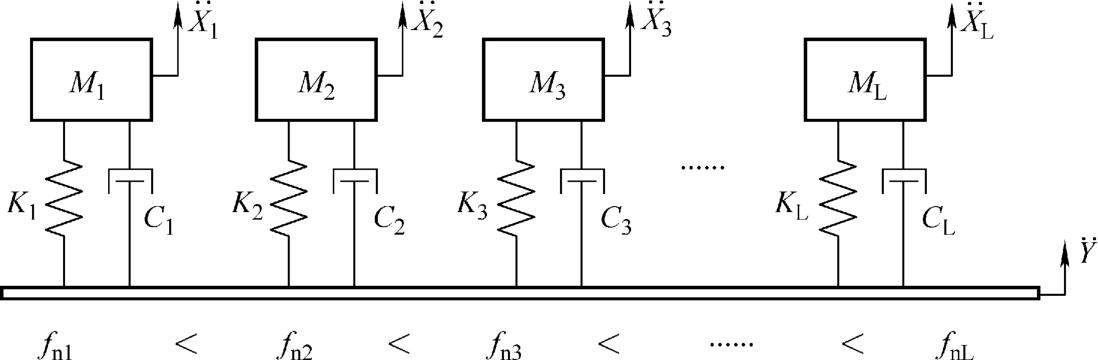 电池包结构虽然零部件很多,结构复杂,但从本质来讲,还是可以近似为由许多单自由度系统组成的复杂系统,每一个固有频率对应一个单自由度系统。电池包的等效单自由度系统如图3.7所示。在同一冲击载荷条件下,系统的每一个固有频率对应的响应加速度是不一样的,且冲击响应谱具有一定的规律。
