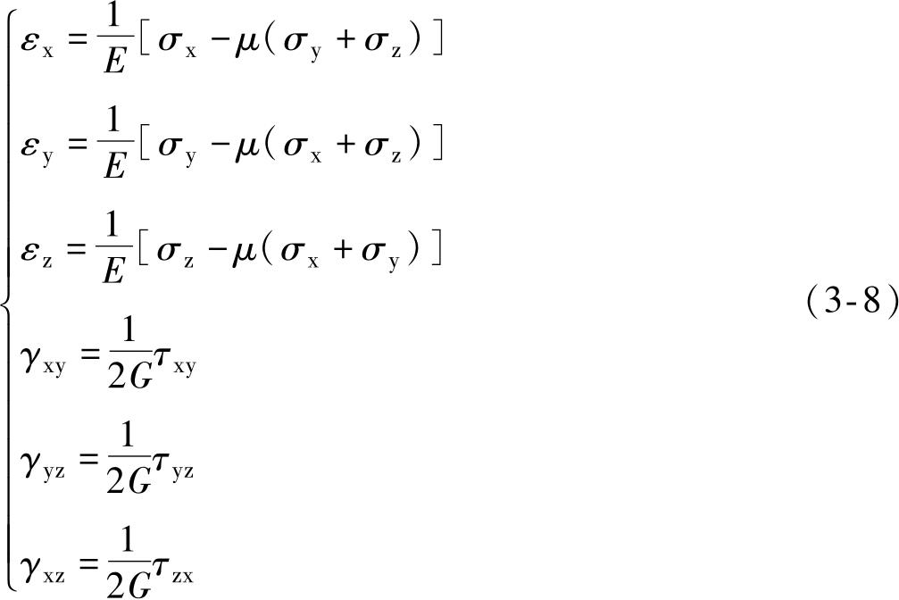 式中, E 为材料的弹性模量,将其推广到一般应力状态下各向同性材料下的广义虎克定律,如式(3-8)所示:
