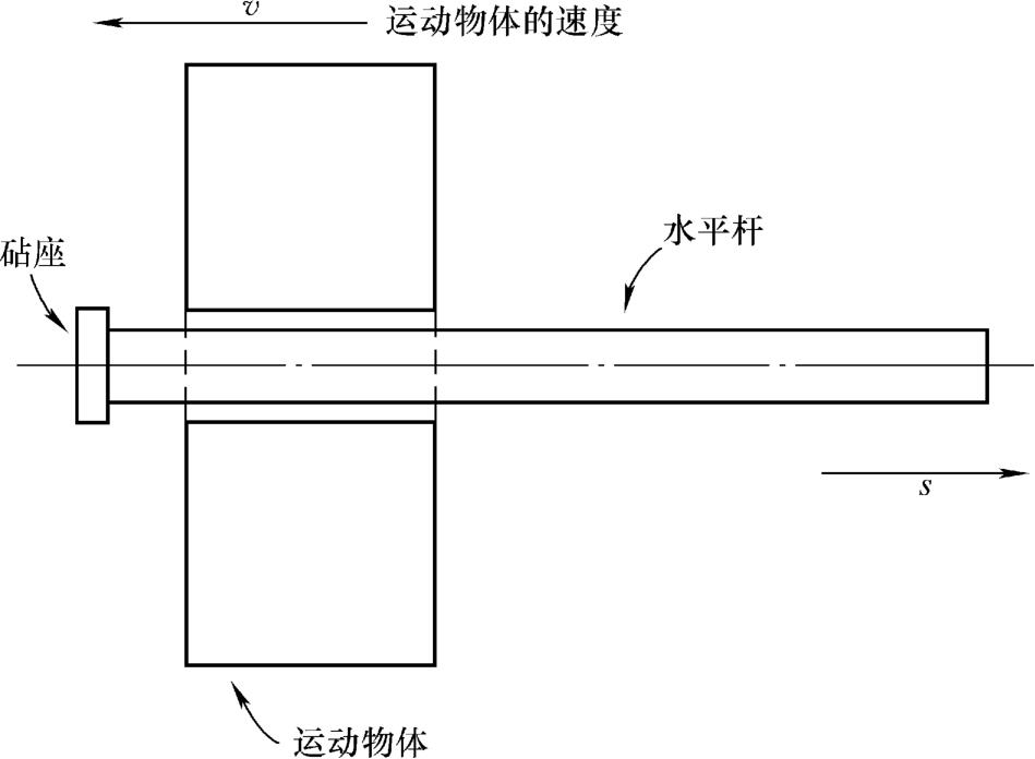 当冲击引起塑性变形时,文献中有研究运动物体对杆端的纵向冲击问题,如图3.3所示,一个质量为 m 的大物体沿轴向撞击杆端,物体的初始速度为 v ,在任一时刻 t ,应力波传入杆一定的距离,由于连续条件,被撞击的杆端部位移的距离等于杆的端部总的伸长,即有:
