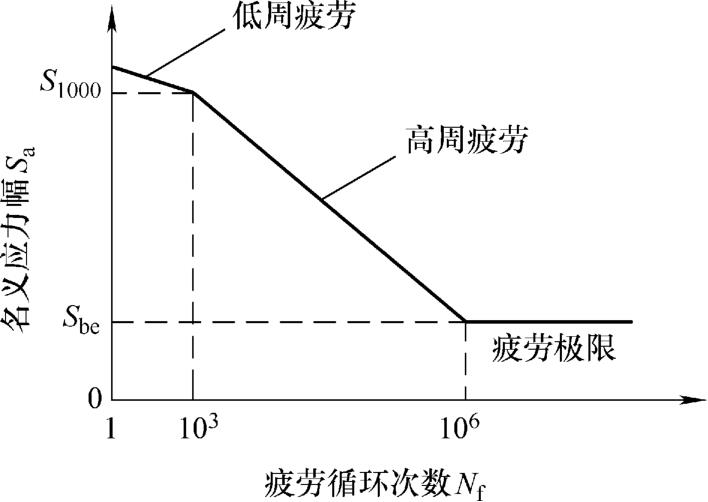 结构在发生疲劳失效前所经历的应力或者应变循环次数称为循环疲劳寿命,一般用 N 表示,试样的疲劳寿命取决于材料的疲劳性能和载荷水平,图3.10 所示为结构所承受的三种常见典型载荷:恒幅载荷、变幅载荷以及随机振动载荷。一般地,载荷越低,试件的疲劳寿命越长;反之疲劳寿命越短。这种载荷水平与循环寿命之间的关系能够通过曲线绘制出来,被称为 S-N 曲线,也称为维勒曲线,图3.11所示为钢材的 S-N 曲线。循环寿命<10 3 次的疲劳称为低周疲劳,循环寿命在10 3 ~10 6 次为高周疲劳,循环寿命超过10 6 次为永久疲劳或极限疲劳。当然,低周疲劳与高周疲劳之间的界限,以及永久疲劳的界限不能由特定循环次数来定义,钢和铝的就不一样。 S 1000 表示疲劳寿命为1000次的疲劳应力幅, S be 表示永久疲劳应力幅。