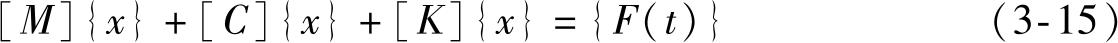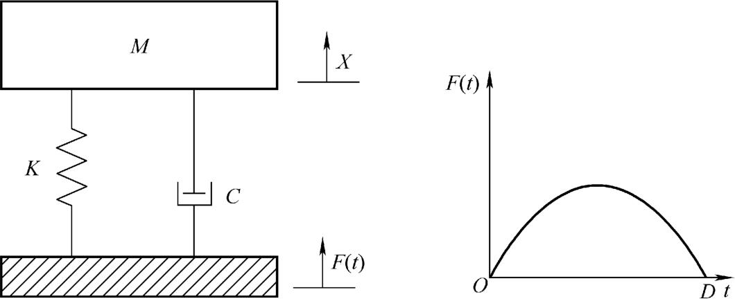 在介绍冲击响应谱时,先介绍一下单自由度系统,如图3.6所示,其中 F ( t )为单自由度系统的基础激励(输入加速度), K 为单自由度系统的等效刚度, C 为单自由度系统的阻尼系数, M 为等效质量。