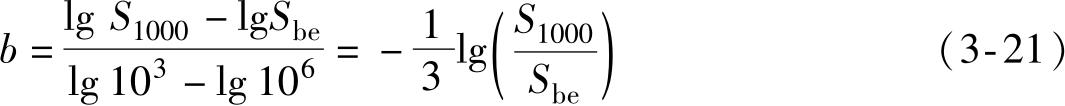 S-N 曲线是疲劳仿真的基础输入数据,在进行疲劳寿命设计时,常常有些材料没有现成的 S-N 曲线,如果通过试验获取则需要耗费大量的时间和资源,因此基于前人的大量研究,李永利博士提出了基于有限的信息估算 S-N 曲线的方法,对于钢制试件,在1、10 3 、10 6 次循环时的强度即可以定义一条 S-N 曲线,这些疲劳强度值分别对应着 S ′ f 、 S 1000 , S ′ f 为修正后的极限抗拉强度,在高周疲劳区域, S-N 曲线的斜率 b 可以用式(3-21)表示: