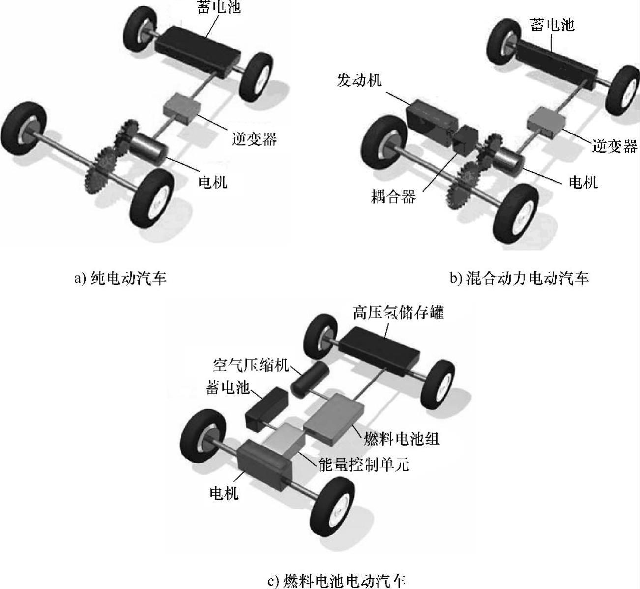 电动汽车根据能量来源和动力组成的不同,可分为纯电动汽车(EV,Elec-tric Vehicle)、混合动力电动汽车(HEV,Hybrid-Electric Vehicle)和燃料电池电动汽车(FCEV,Fuel Cell Electric Vehicle),图1.1为三种电动汽车示意图,它们都要涉及电池散热与能量管理问题。动力电池散热系统是用来确保电池组工作在适宜温度范围的整套系统,包括电池箱、传热介质、监测控制设备等部件。动力电池散热系统有如下几项重要功能: