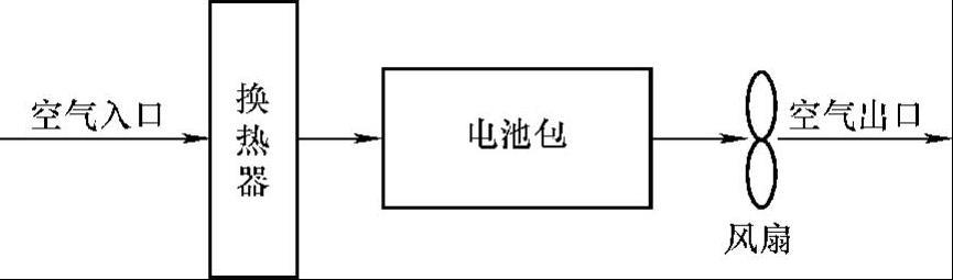 被动式进风散热通常指不使用任何外部辅助能量,直接利用车速形成的自然风将电池组产生的热量带走,不需要额外的部件,结构简单,成本低,整个散热过程热量的交换以自然对流的方式为主,但是其缺点在于散热效率较低,散热性能无法控制,因此需要对电池表面的散热面进行优化以增大电池的散热面积,或者对自然风的风道进行特殊设计,优化自然风经过电池包的流场。其工作原理如图1.2所示。
