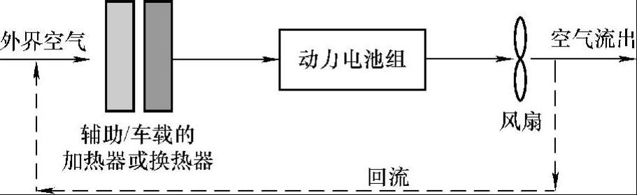 主动式进风散热在散热过程中的热量交换主要依靠强制对流,因此,如果电池模块周围空间允许,可以安装局部散热器或风扇,也可利用辅助的或汽车自带的蒸发器来提供冷风,其工作原理如图1.4所示。该方法对电池的封装设计要求有所降低,一般用于IP67以下且结构较复杂的电池系统,电池在车上的位置也不受限制,对整车的结构设计影响较小,是目前电动汽车用动力电池组和混合动力汽车动力电池组中应用最广泛的散热方法。但是,因为空气的热导率较低,且受外界环境温度的影响较大,所以主动式进风散热系统在散热过程中存在压力损失较大、电池组温度一致性低等问题。因此,使用主动式进风散热方式对动力电池组进行散热时,需对其冷却风道进行特殊设计,根据场协同原理,速度梯度与温度梯度之间的夹角越小,其协同性越好,故研究主动式进风散热系统,应同时对系统的速度场与温度场进行研究。