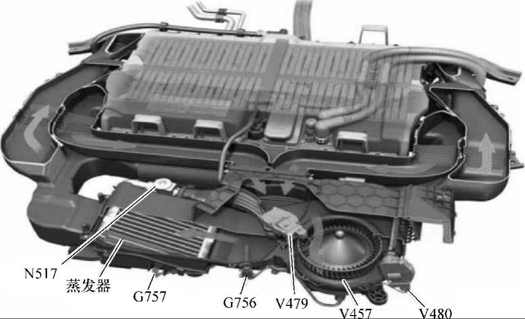 V457—电池风扇 V479—电池通风管道定位电动机 V480—电池通风管道定位电动机 G756—电池蒸发器前端温度传感器 G757—电池蒸发器后端温度传感器 N517—电池制冷剂关闭阀