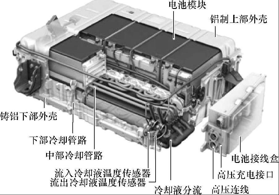 液冷模式即电池采用水冷方式换热,如图1.8所示。一般会增加一个换热器与制冷循环耦合起来,通过制冷剂将电池的热量带走。整个系统主要包括电子水泵、换热器、电池散热板、PTC加热器、膨胀水箱。电池需要冷却时,电池通过散热板与冷却液进行换热,加热后的冷却液被电子水泵送入换热器内,在换热器内部一侧通入制冷剂,一侧通入冷却液,两者在换热器内充分换热,热量被制冷剂带走,冷却液流出换热器再流入电池,形成一个循环。电池需要加热时,关闭制冷回路,开启PTC加热器,冷却液被加热后送入电池内部,通过散热板加热电池。可以通过控制制冷回路通断以及控制PTC加热功率,来控制冷却液的温度,从而控制电池内部温度。此种方案系统比较复杂,成本比较高。液冷是目前许多电动乘用车的优选方案,国内外的典型产品如宝马i3、特斯拉、通用沃蓝达(Volt)、华晨宝马之诺、吉利帝豪EV。
