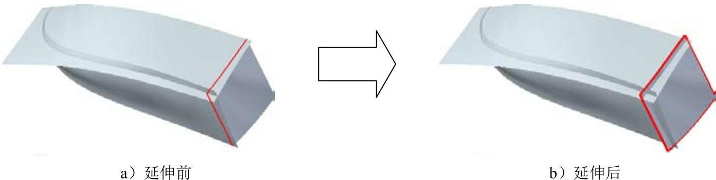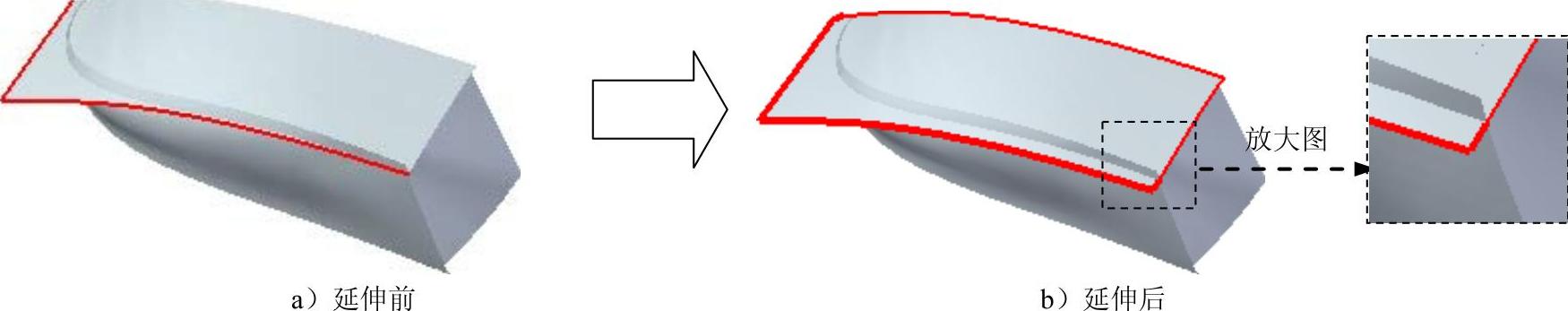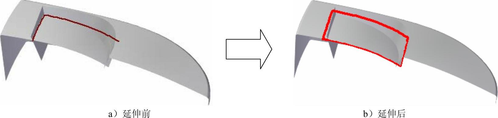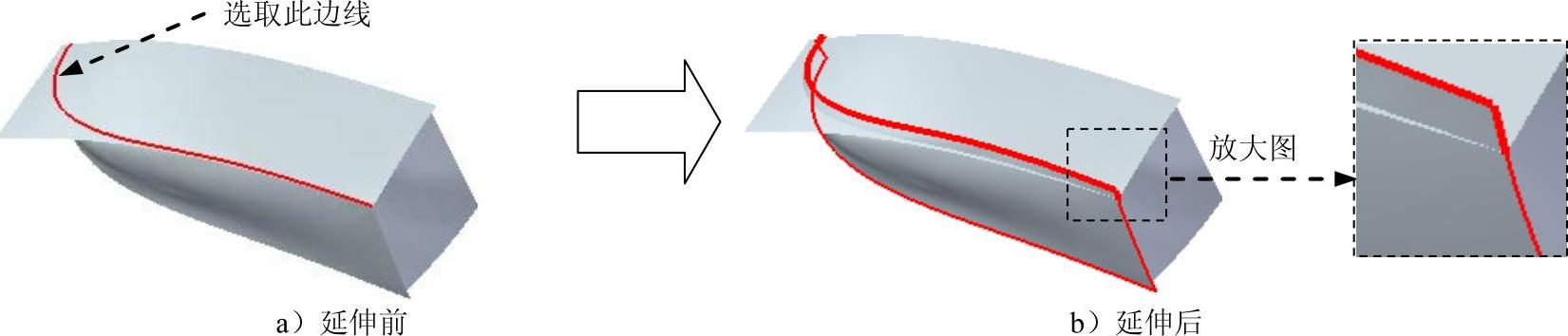 (2)定义延伸边线。选取图12.57a所示的边线为延伸边线,然后右击。