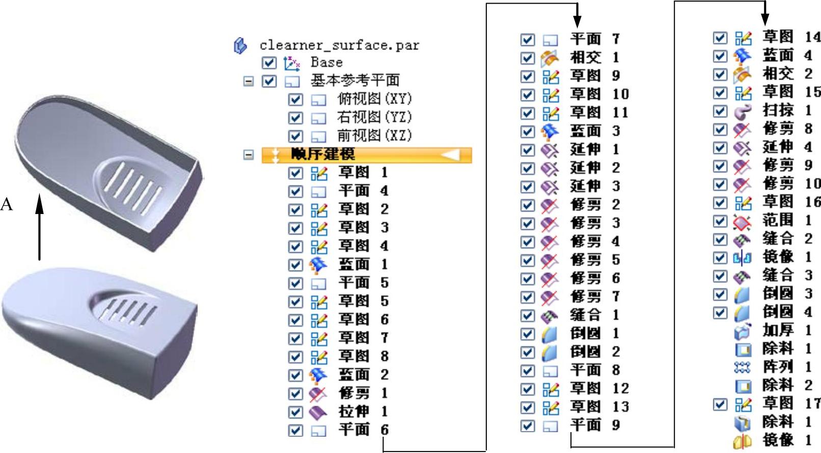 该实例是一个吸尘器上盖的模型,其主要轮廓是通过蓝面曲面修剪之后缝合而成的。因为在模型的创建过程中用到了大量的样条曲线,所以读者创建的最终模型会与本书中的模型有些差异。零件模型及路径查找器如图12.1所示。