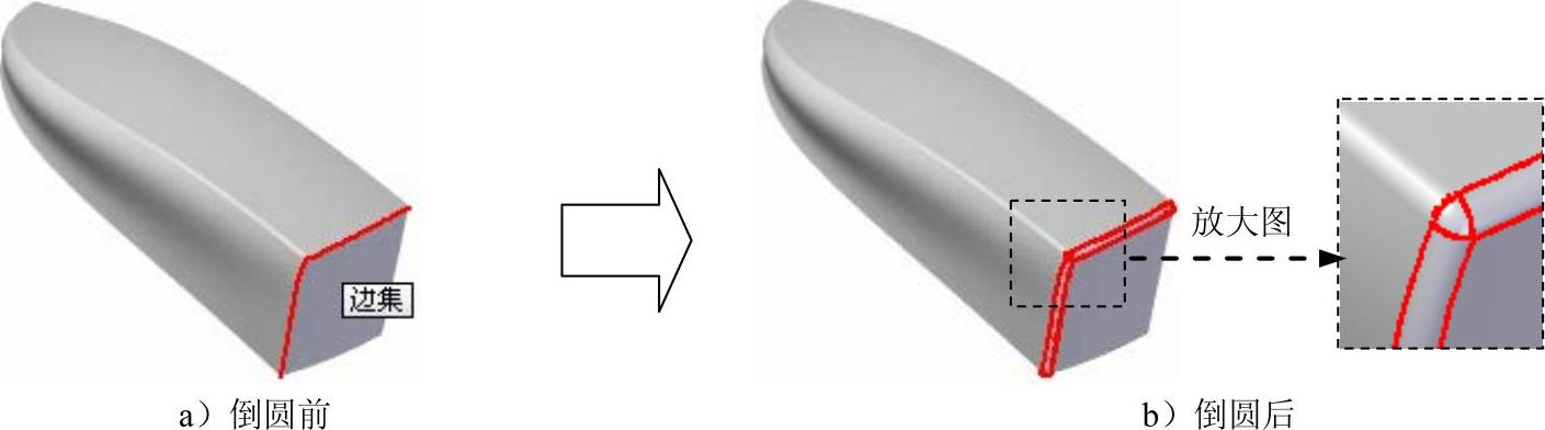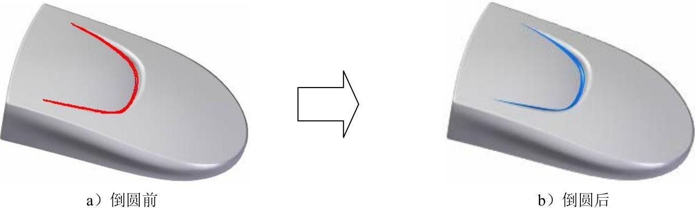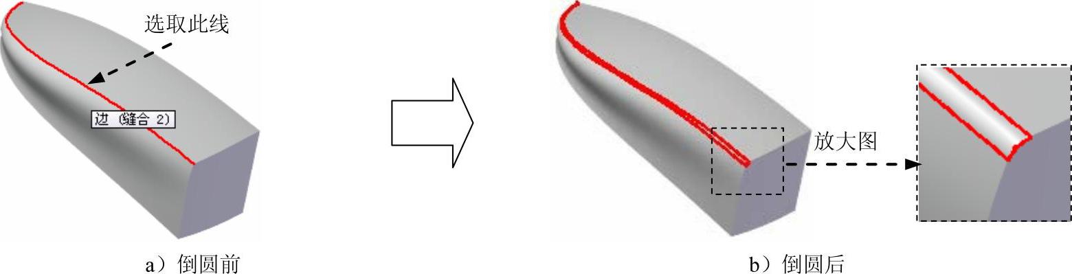 Step53.创建图12.67b所示的倒圆3。选择图12.67a所示的边线为要倒圆的对象,倒圆半径值为8.0。