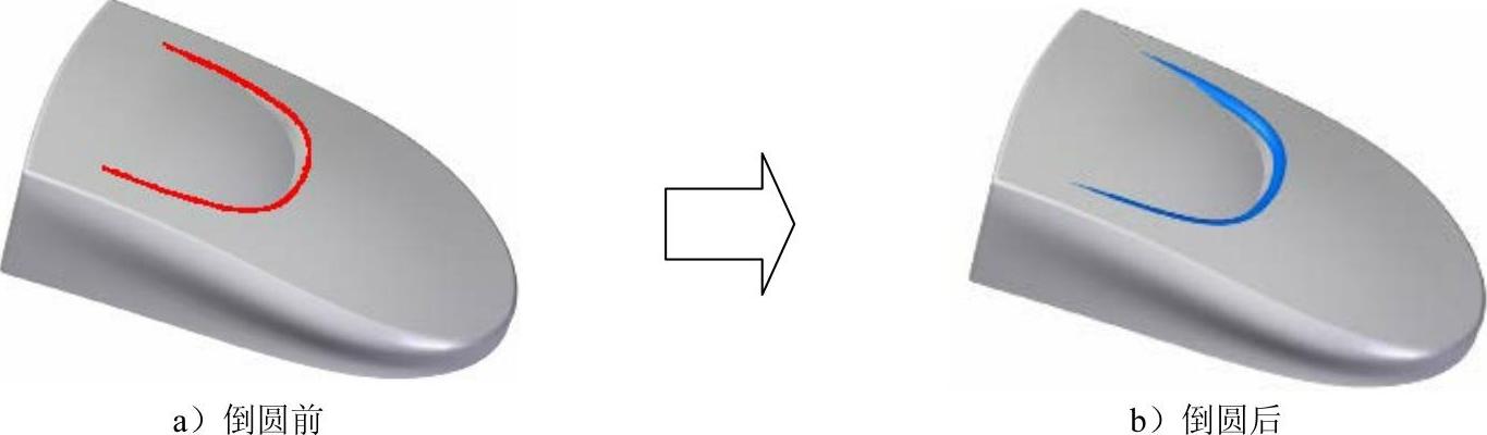 Step54.创建图12.68b所示的倒圆4。选择图12.68a所示的边线为要倒圆的对象,倒圆半径值为4.0。