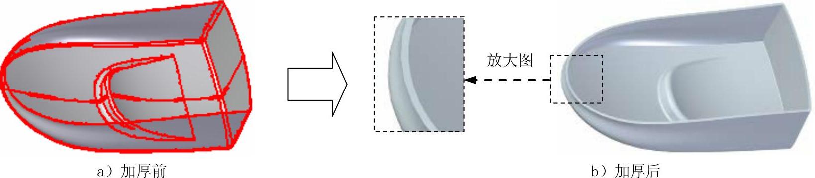 (4)定义加厚方向。调整曲面的加厚方向为向内加厚,单击确定。