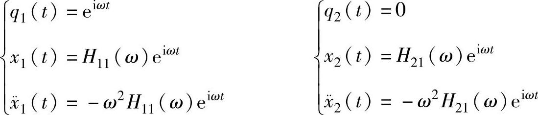 求响应 x 1 、 x 2 对应于输入 q 1 的频率响应函数 H 11 ( ω )和 H 21 ( ω )。根据单位谐函数法,令
