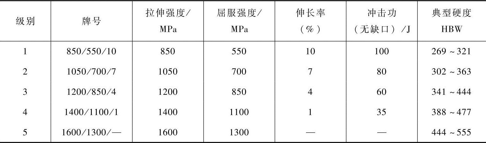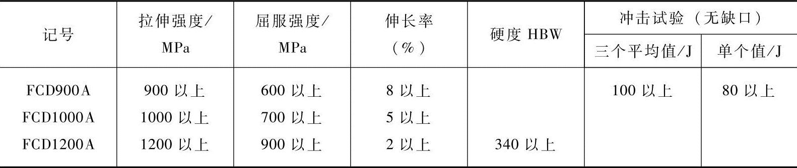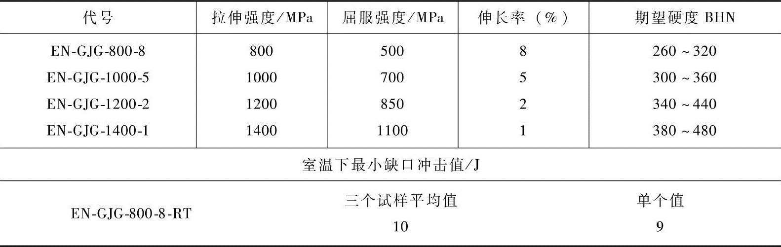 在20世纪80年代中、后期、英国铸铁研究协会(BCIRA)和日本球铁协会(JDIS)以及美国机械工程师协会(ASME)的齿轮研究协会(AGMA)和汽车研究协会继续对ADI的工艺过程进行量化研究。1989年,美国工程协会制定了包括英制和公制在内的ADI五个等级标准,见表2-36,欧洲和日本的标准见表2-37、表2-38。