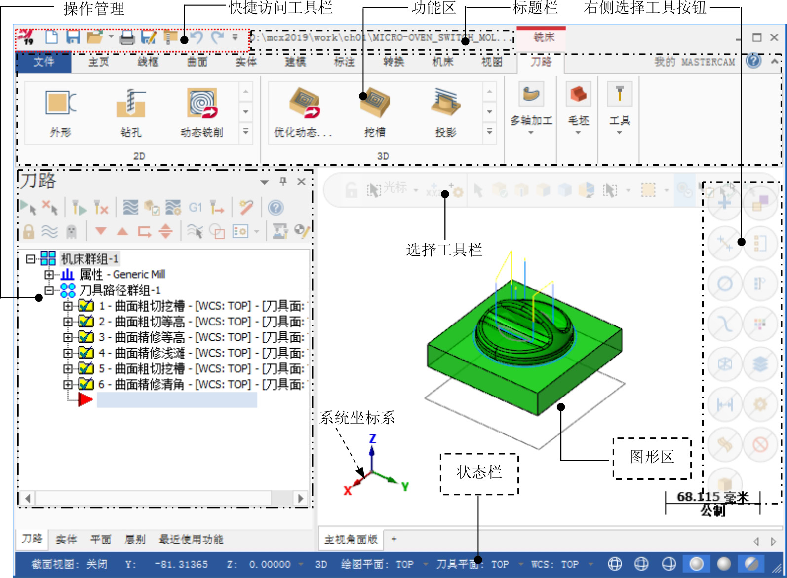 Mastercam 2019用户界面包括操作管理、快捷访问工具栏、功能区、标题栏、系统坐标系、选择工具栏、右侧选择工具按钮、状态栏以及图形区(图1.2.10)。