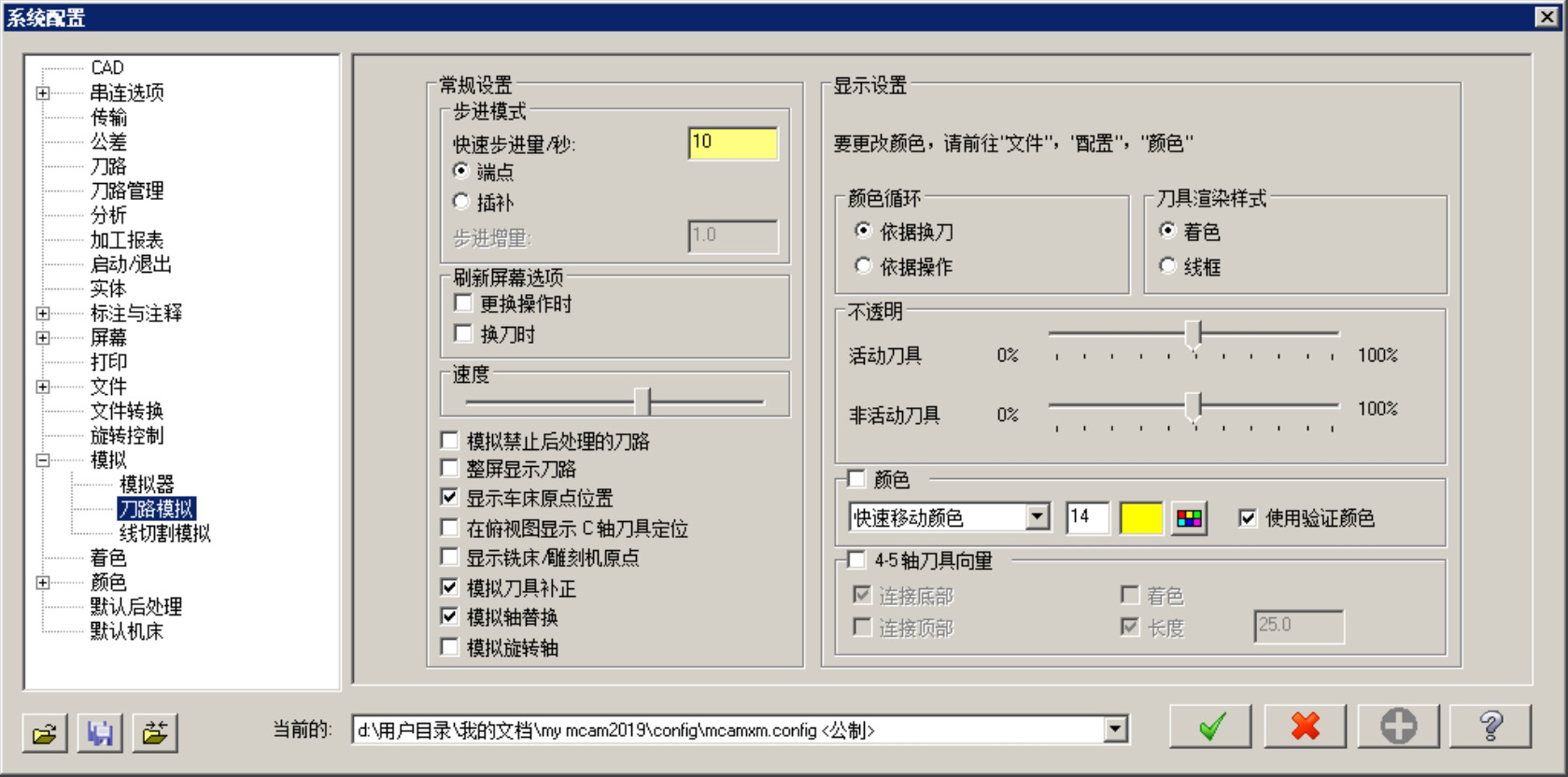 选择下拉菜单 命令,系统弹出“系统配置”对话框。该对话框中的 选项卡(图2.1.8)主要是用于设置刀具路径模拟的步进模式、刷新屏幕选项、刀具显示、夹头显示、颜色显示等。