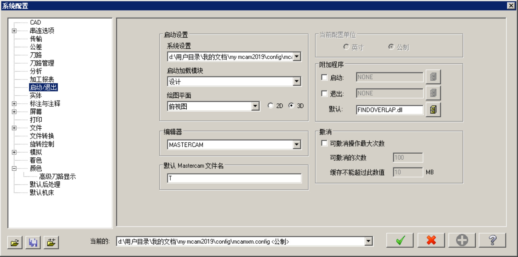 选择下拉菜单 命令,系统弹出“系统配置”对话框。该对话框中的 选项卡(图2.1.14)主要是用于设置Mastercam 2019在启动/退出时当前的配置文件、快捷键、加载模块、绘图平面、编辑器、附加程序,以及可撤销操作的最大次数等参数。
