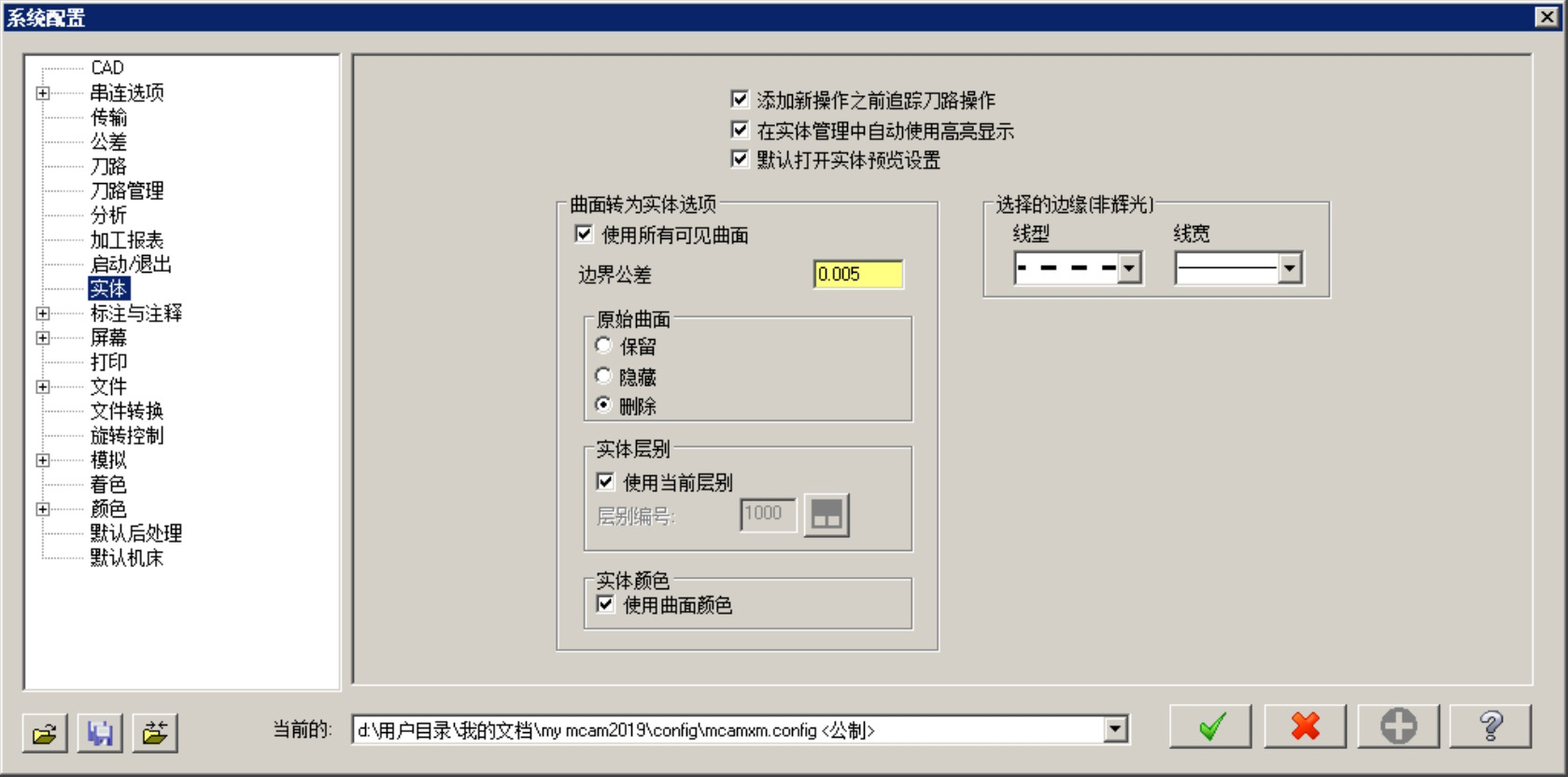 选择下拉菜单 命令,系统弹出“系统配置”对话框。该对话框中的 选项卡(图2.1.15)主要是用于设置实体的生成和显示控制参数,如定义新的实体操作在实体管理器中的位置、原始曲面的处理和实体所在的图层等。