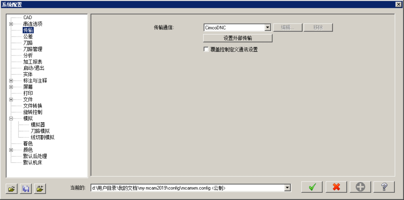 选择下拉菜单 命令,系统弹出“系统配置”对话框。该对话框中的 选项卡(图2.1.17)主要是用于对控制器和Mastercam之间的数据传输通信进行设置。