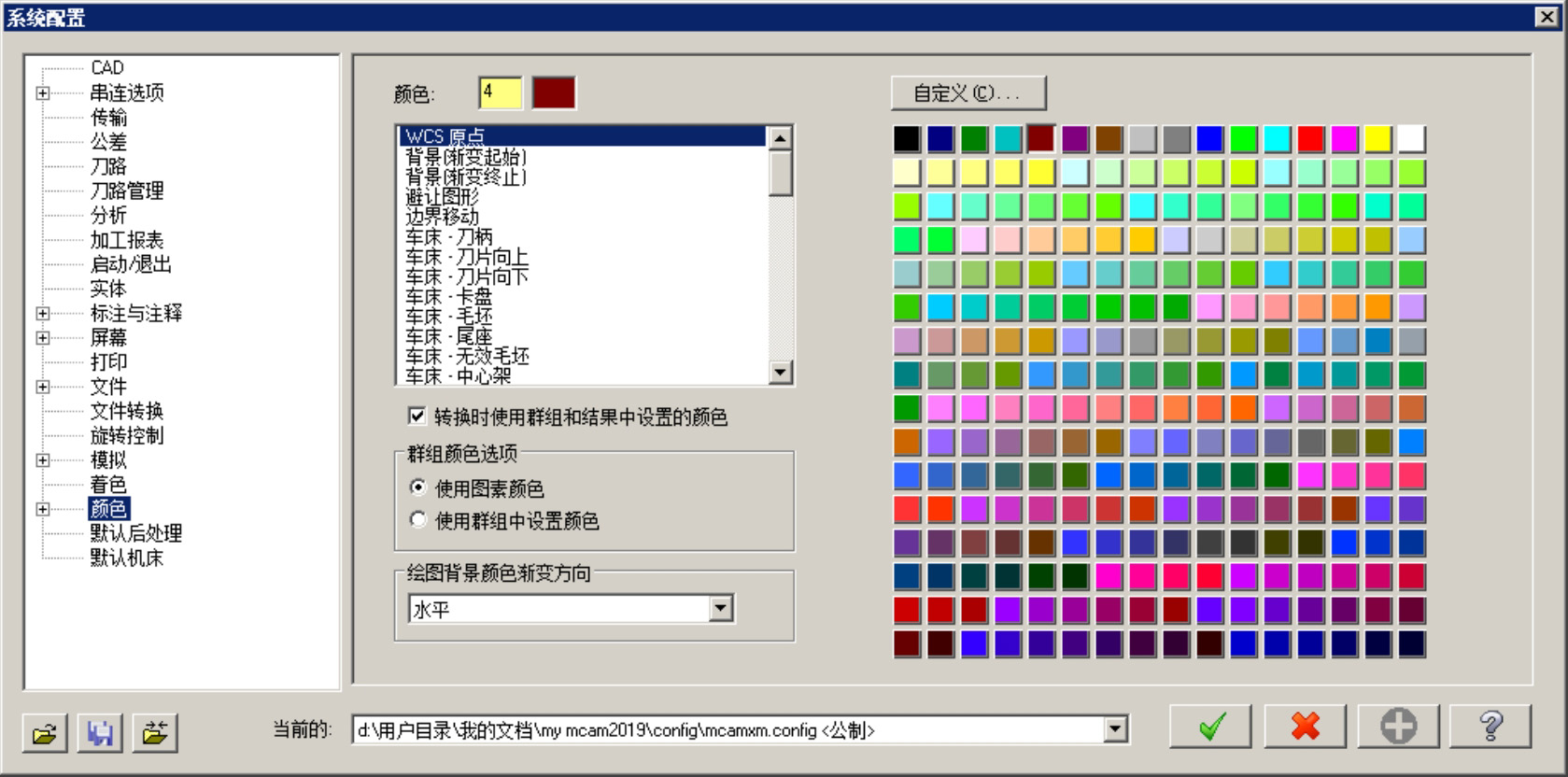 选择下拉菜单 命令,系统弹出“系统配置”对话框。该对话框中的 选项卡(图2.1.21)主要是用于对Mastercam 2019界面和图形的各种默认颜色进行设置。