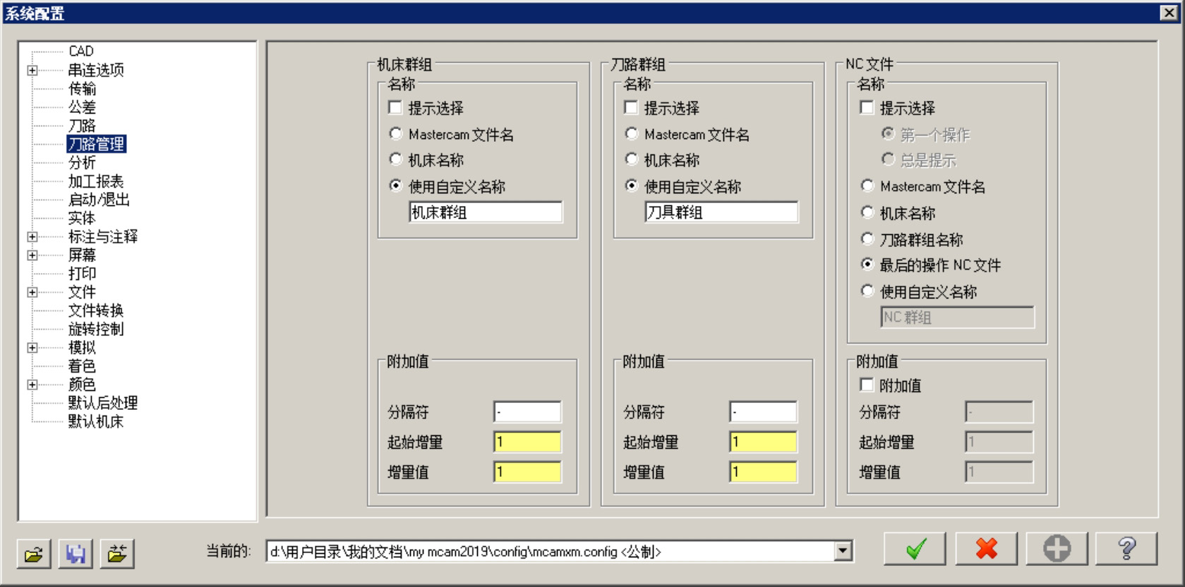 选择下拉菜单 命令,系统弹出“系统配置”对话框。该对话框中的 选项卡(图2.1.7)主要是用于设置机床群组的名称和附加值、刀具路径群组的名称和附加值、NC文件的名称和附加值。