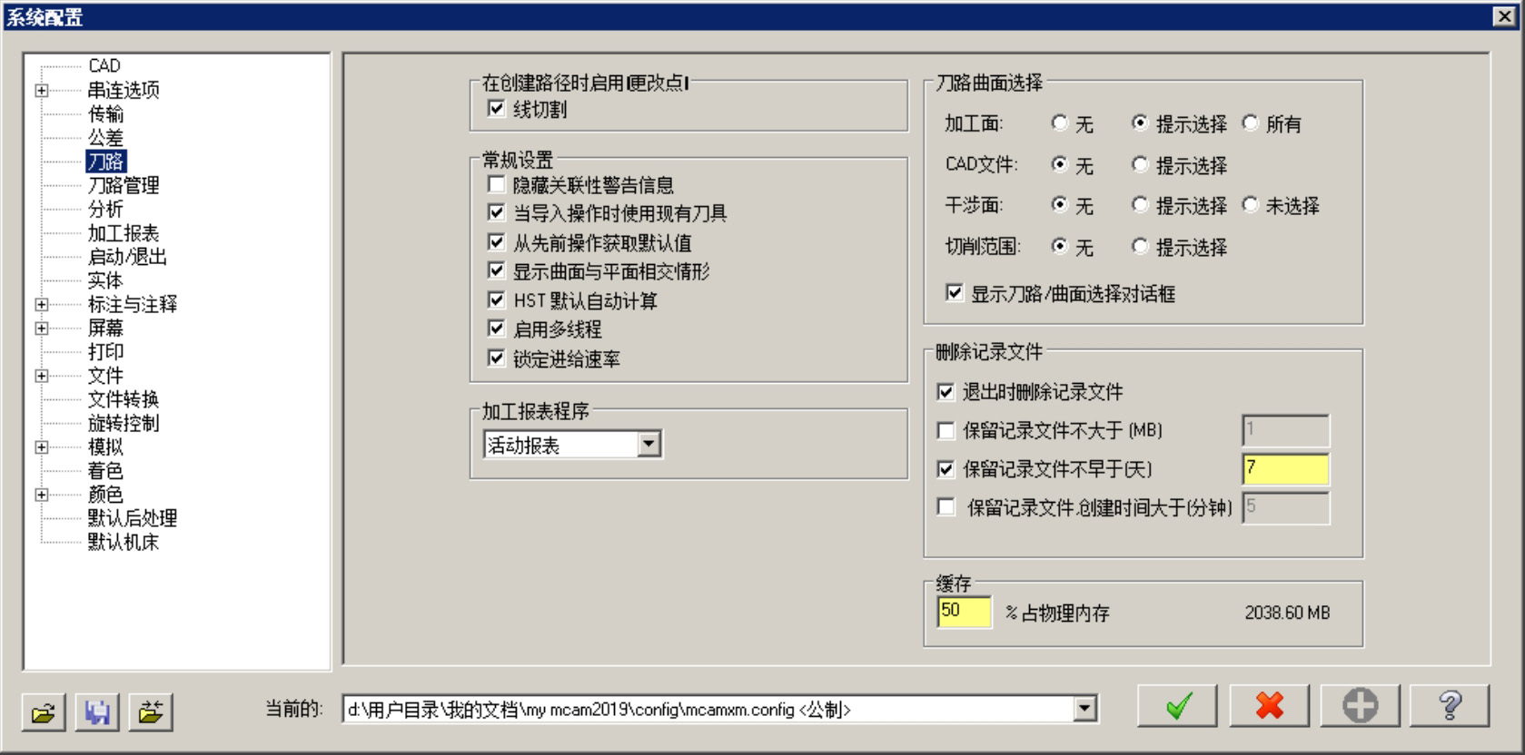 选择下拉菜单 命令,系统弹出“系统配置”对话框。该对话框中的 选项卡(图2.1.6)主要是对刀具路径显示、刀具路径的曲面选取、标准设置、删除记录文件、缓存等进行设置。