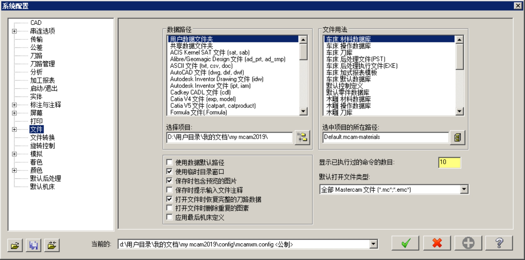 选择下拉菜单 命令,系统弹出“系统配置”对话框。该对话框中的 选项卡(图2.1.17)主要是用于设置Mastercam 2019运行时所需的默认文件,其中包括数据路径、数据文件、自动保存和备份等。