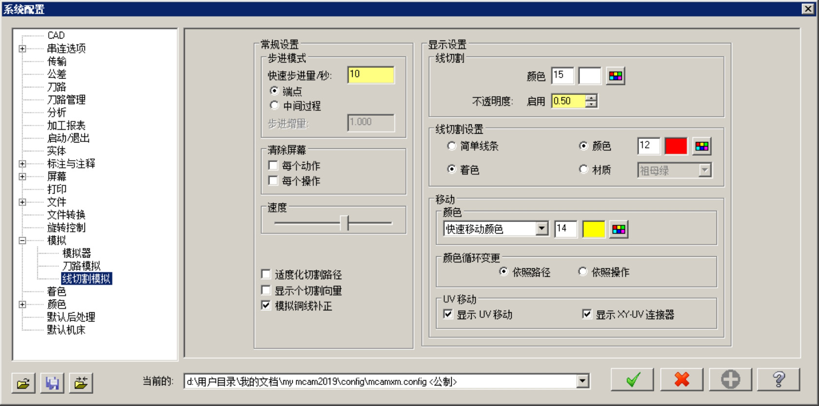 选择下拉菜单 命令,系统弹出“系统配置”对话框。该对话框中的 选项卡(图2.1.19)主要是用于设置影响线切割运动和显示的参数,包括常规设置中的步进模式、刷新屏幕选项等,以及外观中的线切割设置和位移的颜色、颜色循环变更、UV移动等。