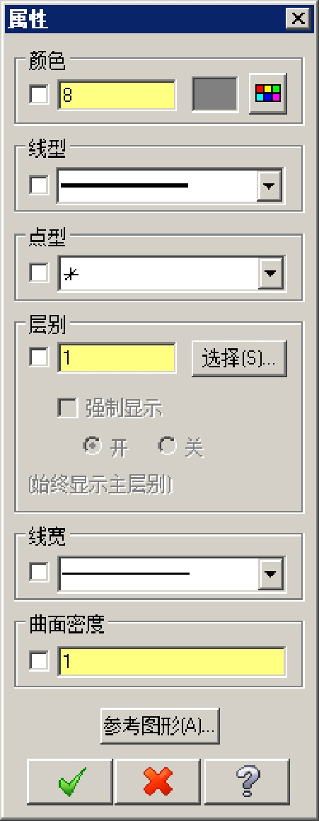 属性的综合设置是指用户一次可以设置图素的多个属性,包括图素的颜色、线型、线宽、点样式、层别、曲面密度等。