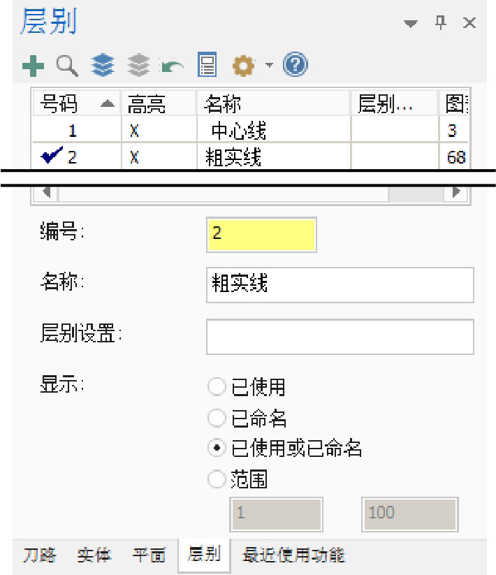 选项卡,系统弹出图2.2.4所示的“层别”选项卡。用户可以通过该选项卡新建图层、设置当前图层以及设置显示和隐藏图层。