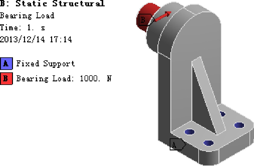 图2.3.9所示的支架模型,支架上的四个小孔位置被完全固定,支架上部圆柱面受到一个水平向右的轴承载荷作用,现在要分析材料的密度、轴承载荷大小与最小应力、最大应力及最大位移变形之间的关系。