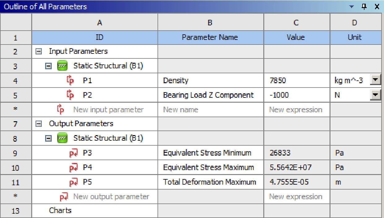 初始情况下,材料密度为7850kg/m 3 、轴承载荷大小为1000N;在这种情况下,最小应力和最大应力分别为0.026833MPa和55.642MPa,最大位移变形为0.047555mm。需要分析当材料密度分别为7000 kg/m 3 和6500 kg/m 3 ,轴承载荷大小分别为500N、200N和100N时的最大、最小应力及最大位移变形结果。