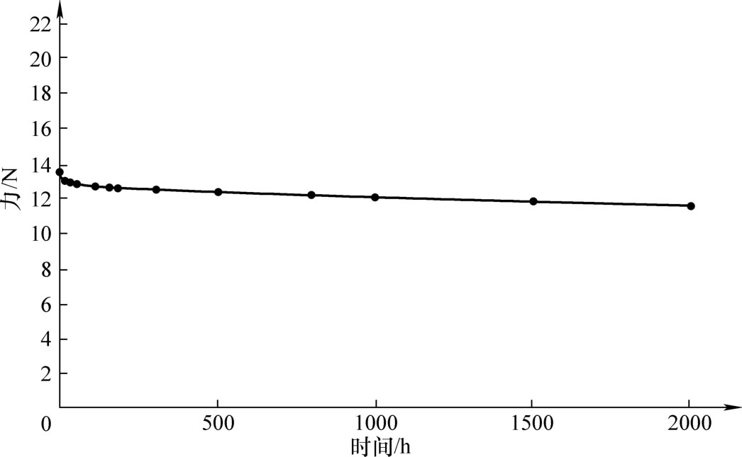 (1)压缩量的选取 不同于压缩永久变形,压缩应力松弛测试多以实际工况时零件的压缩量为准,选取初始压缩量时的作用力起始值,记录不同时间点时的作用力,绘制应力松弛曲线,通过曲线可以直观地看出,随着时长增加应力松弛衰减情况趋于稳定。如图2-15所示,某材料的应力松弛曲线图。