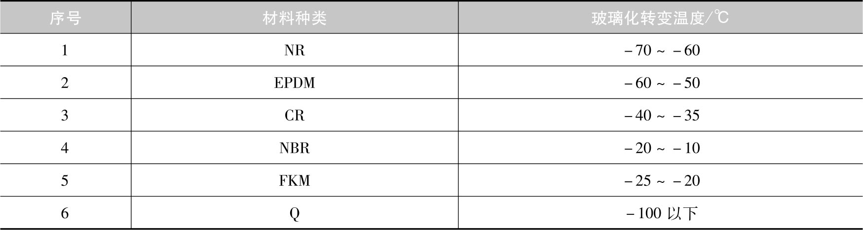 弹性是橡胶材料重要的性能之一,随着温度的降低,橡胶材料中可移动链段逐渐被冻结变脆,达到玻璃化温度后,橡胶由高弹态转变到玻璃态,橡胶变脆、失去弹性,导致其失去使用价值。因此对于橡胶材料而言,玻璃化转变温度( T g )通常作为衡量橡胶材料最低使用温度主要参考指标,常用橡胶材料的玻璃化转变温度见表2-8。