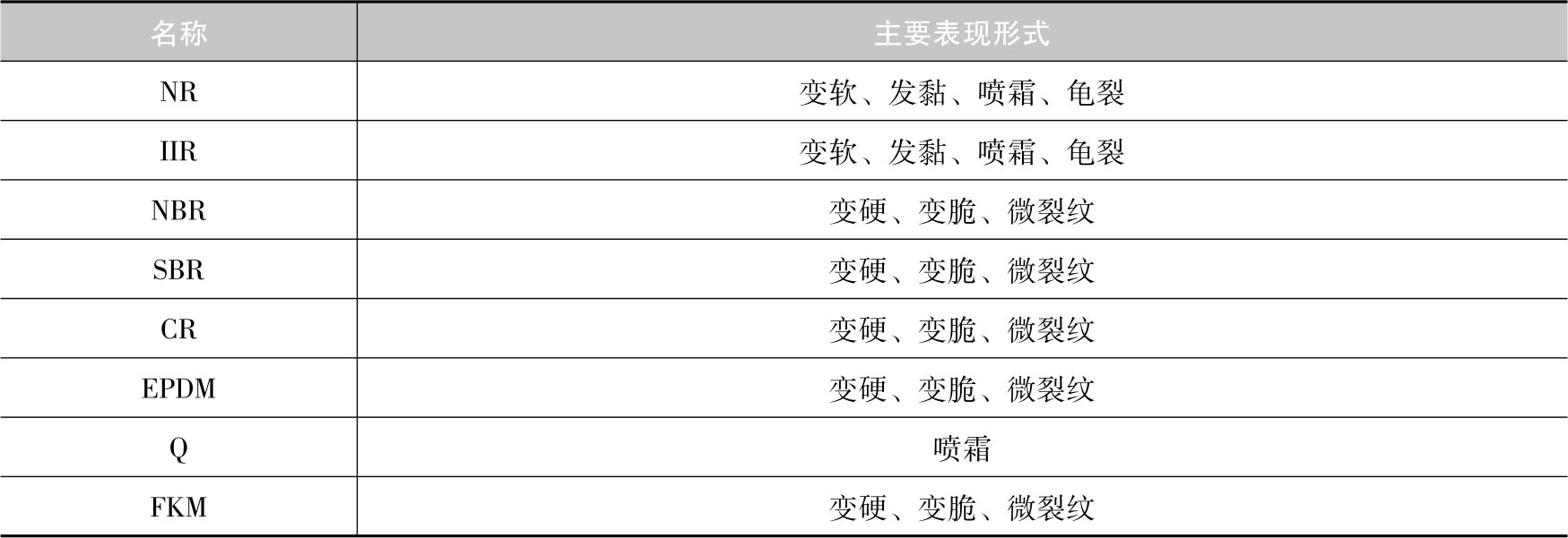 橡胶老化的表现形式主要有:表面变色、喷霜、发黏、龟裂或微裂纹、发脆变硬等,不同种类橡胶的老化现象不同,常见橡胶老化表现形式如表2-7所示。