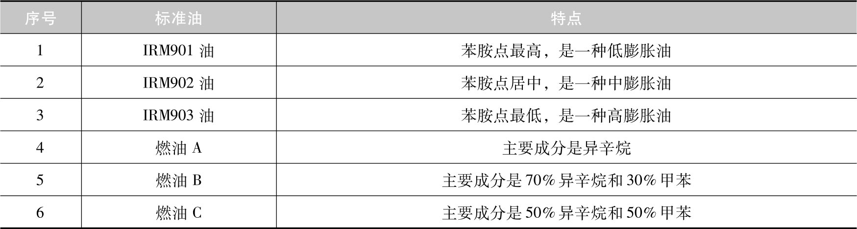 由于汽车整个系统涉及液体介质或油脂类介质较多,在测试橡胶材料耐介质性能时,很难完全做到使用实际工况接触的介质,为了统一测试标准,现在各国形成了很多标准油品,进行模拟实际使用时的油品,目前比较通用的标准油及其特点见表2-9。