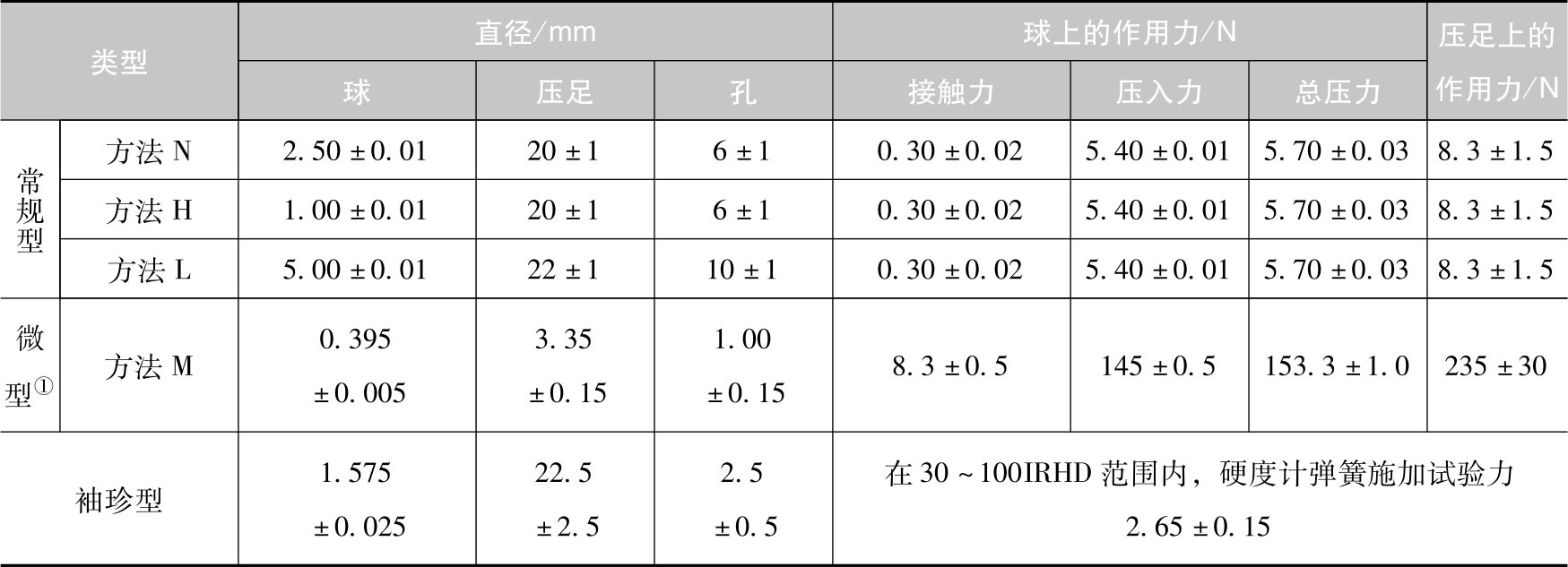 表2-6 三种类型国际硬度计的主要部件尺寸和作用力对比